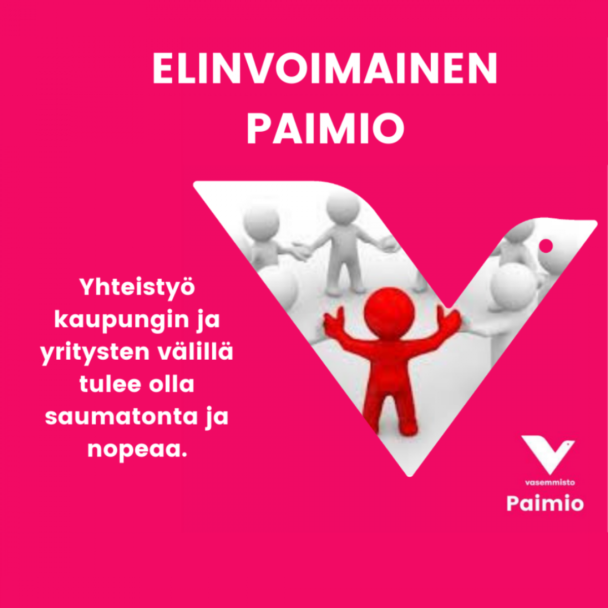 Kilpailukykyinen yrityskanta tarjoaa kuntalaisille työpaikkoja ja lisää kaupungin houkuttelevuutta. Yritysten toimintaedellytyksiä onkin kehitettävä niin, että uudet yritykset ja muualta siirtyvät yritykset kokevat Paimion houkuttelevaksi sijoittumisympäristöksi. Tämä edellyttää saumatonta ja nopeaa yhteistyötä kaupungin ja yritysten välillä. Ei kuitenkaan yksin riitä, että pyrimme houkuttelemaan uusia yrityksiä Paimioon, vaan tämän lisäksi on satsattava voimakkaasti myös jo olemassa olevaan yrityskantaan. Kaupungin tulee omalta osaltaan omalla päätöksenteollaan pyrkiä turvaamaan yritysten toimintamahdollisuudet.